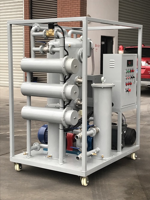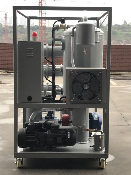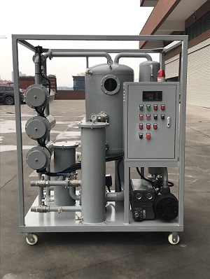 液壓油過濾機工作時,污染油液在外界大氣壓真空吸進的作用下經入口進入加熱器,加熱后的油液進入初濾器,大顆粒雜質被濾除,然后油液進入分水器,真空分離器,流過特制發散裝置。該發散裝置使單位體積的油液產生巨大的表面面積,讓污染油液曝露于相對濕度很低的真空中,從而清除油中的水、空氣和氣體。蒸發的水蒸汽、氣體所形成的混合氣體通過水箱和冷卻器冷凝成液體,一同進入儲水器,剩余的氣體被真空泵抽出。除去水分的油液被排油泵輸入精濾器除去微粒雜質,即為凈化油,完成一個凈化過程,根據含水量的多少,須多次循環才能完全除去水分。